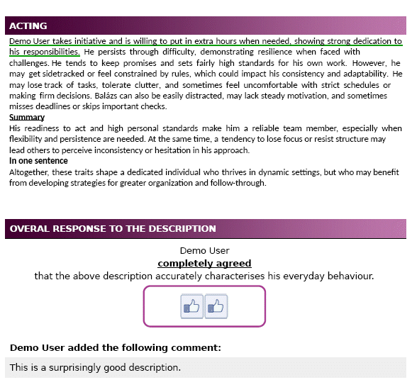 At the end of the questionnaire, every participant receives their personalized description, which they can rate and comment on online, both in detail and as a whole. These ratings and comments appear in the printed report. The chart below shows how much test-takers, on average, agreed with the description created about them.